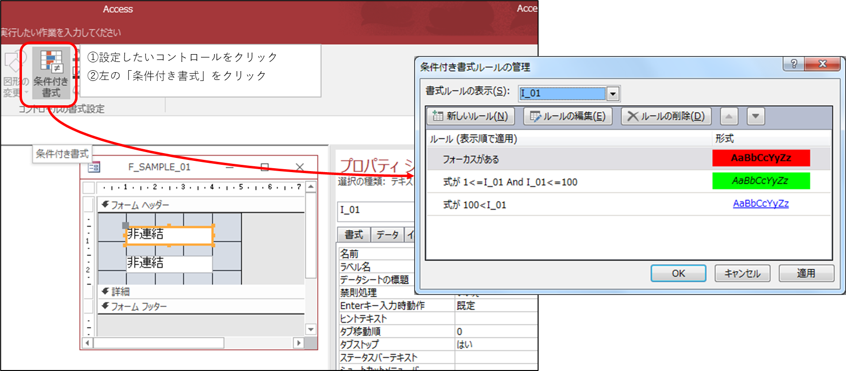 ・Access 2000のバージョンからAccessでもExcelと同じような条件付き書式が利用可能となった。