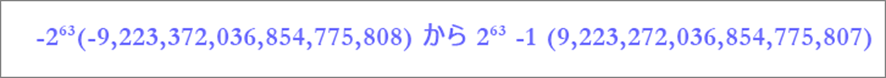 • ODBCのSQL_BIGINTデータ型や、SQL Server の BIGINTデータ型などと互換性があります。