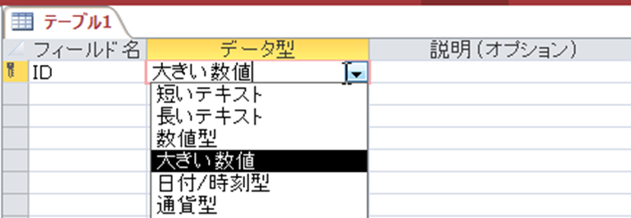 注: 大きい数値データ型は、Access 2007-2016 ファイル形式より前の Access ファイル形式 (.mdb) では、どのような場合でもサポートされません。