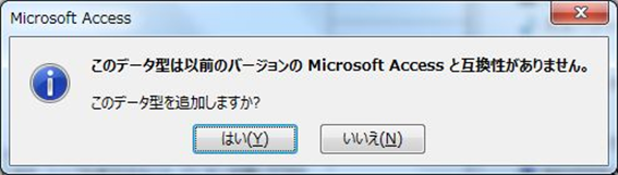 [大きい数値]フィールドをテーブルに追加して、そのテーブルのデザインを保存すると、[大きい数値]データ型を効果的に使えるようになります。ただし、そのデータベースは以前の Access バージョンと下位互換性がなくなります。テーブル デザインを保存する前に、データベースの互換性を保つ必要があるときのために、警告メッセージで通知されます。