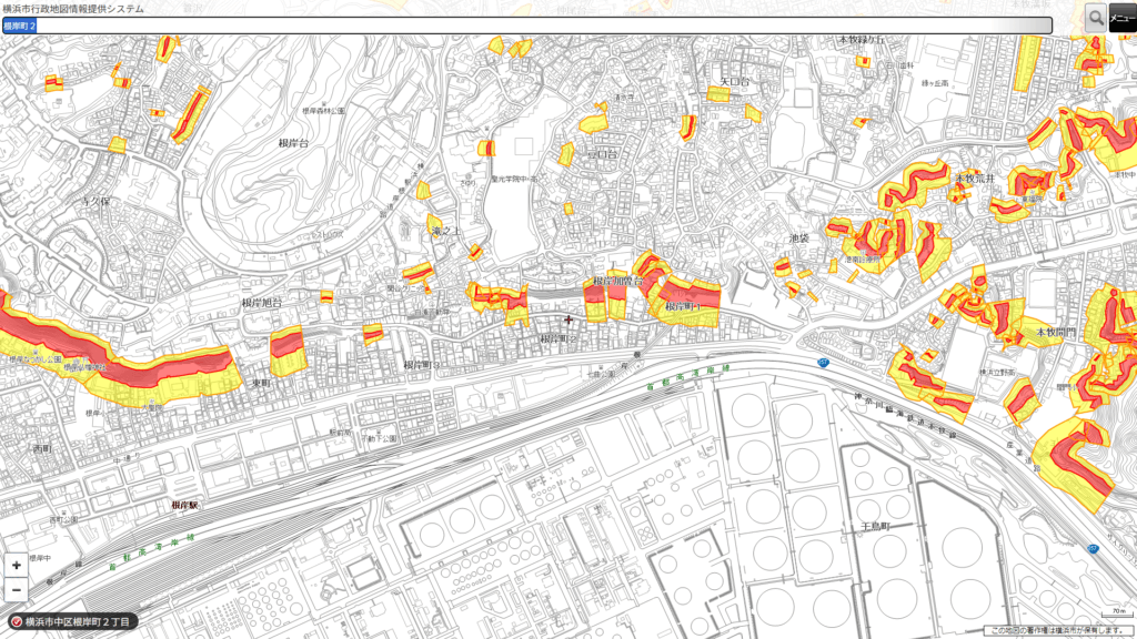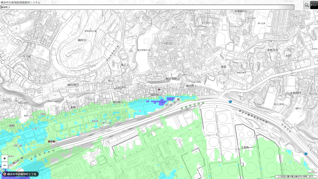 神奈川県横浜市中区根岸町2丁目あたりを中心としたハザードマップです。